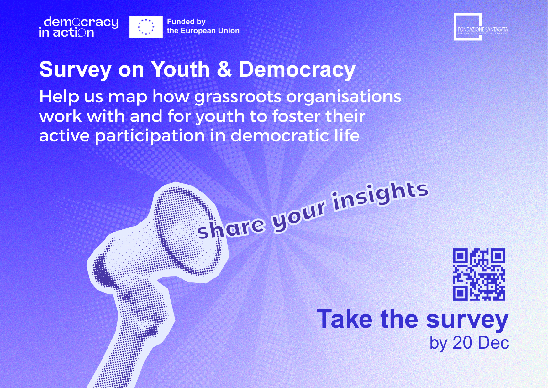 Our sister project Democracy In Action invites European grassroots arts and culture organisations across Europe to contribute to a new survey, exploring how they work with and for young people to strengthen civic engagement and democratic participation.